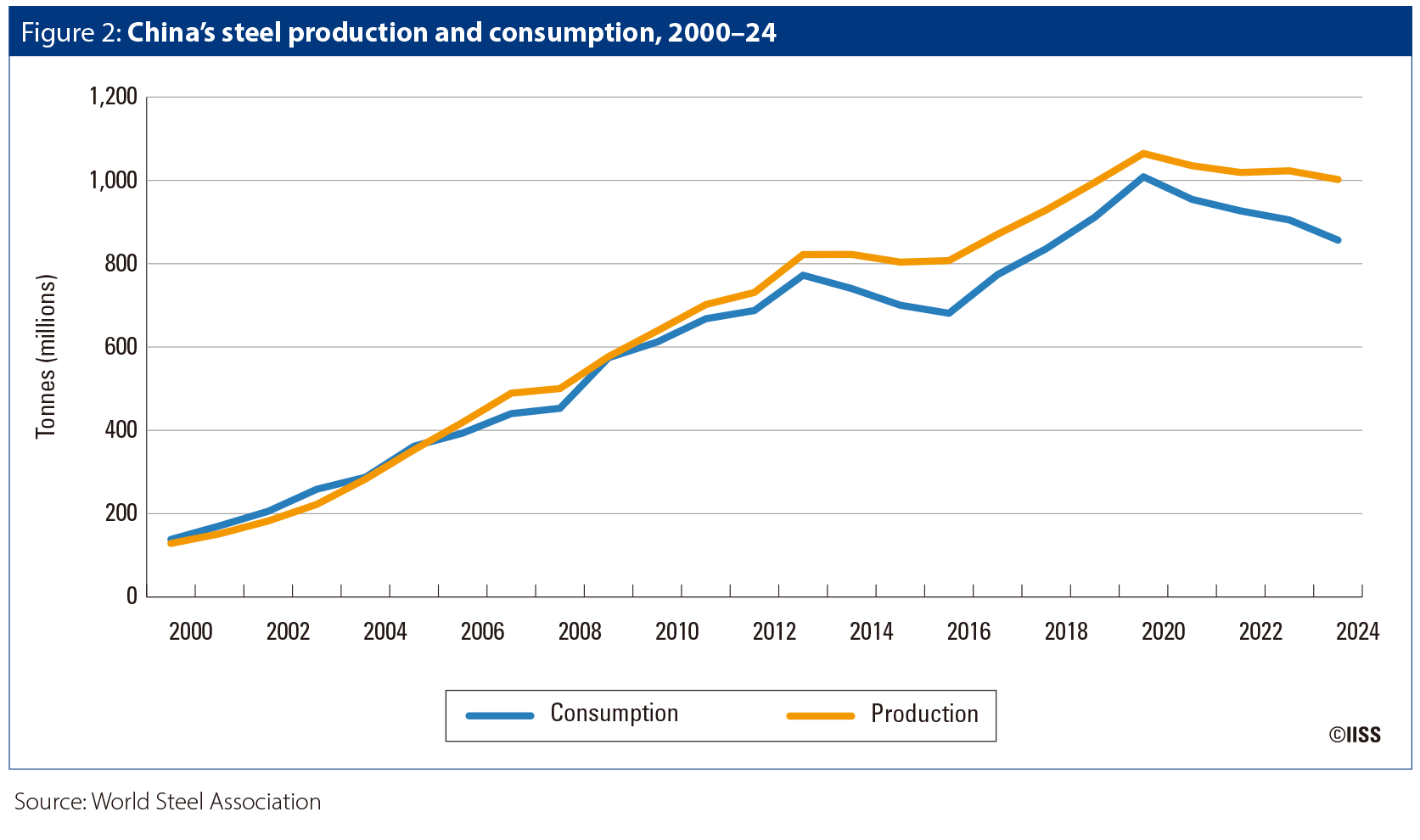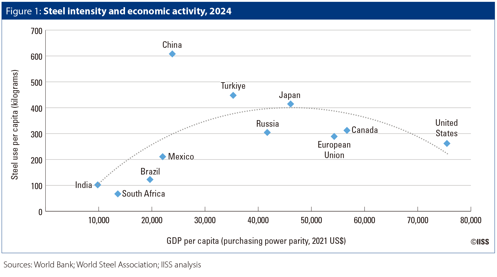 China’s apparent steel use (estimated based on production minus exports and change in stocks) peaked in 2020 at 1bn tn, according to the World Steel Association, but fell to 857m tn by 2024. A further fall looks likely in 2025. The ongoing downturn in China’s real-estate construction sector explains most of this decrease. Steel demand from the auto sector and from green-energy technology (electric vehicles and wind turbines, for example) has been increasing, but these sectors are growing from a much lower base.