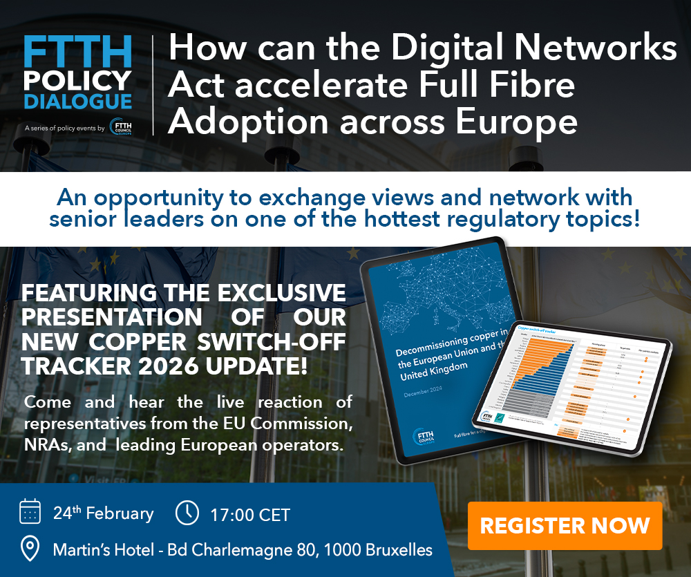 During this event, the FTTH Council Europe will share its views on the DNA and highlight copper switch-off as a key driver of adoption and predictability. Cullen International will also present its latest report on copper switch-off, covering national developments and best practices, followed by a discussion with policymakers, regulators and industry representatives on enabling faster fibre rollout across Europe. Click here for more information.